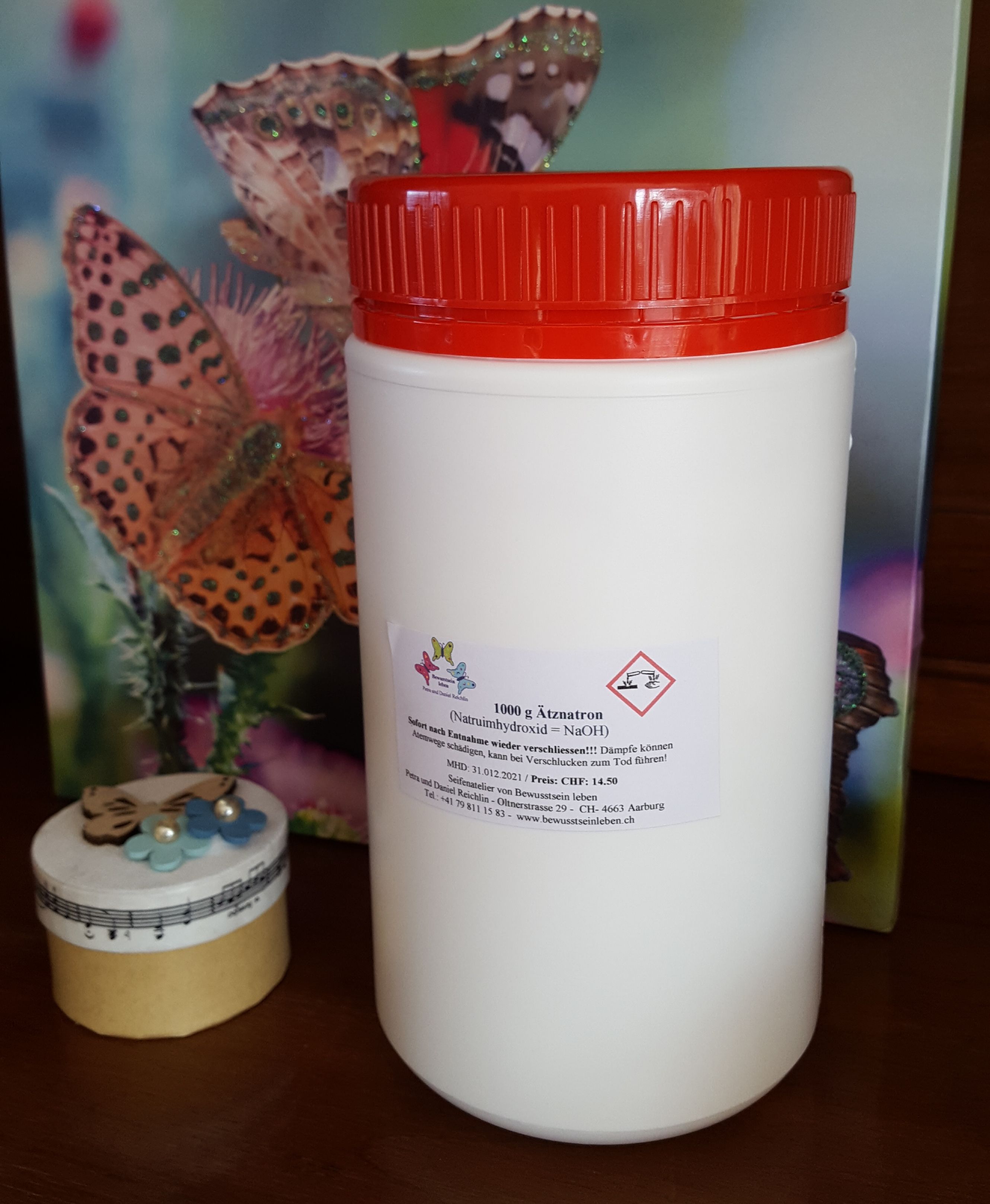 Natriumhydroxid (chem. Formel: NaOH) ist ein weisser, kristalliner und geruchloser Stoff, welcher sich in Wasser durch grosse Wärmeentwicklung auflöst und mit dem Kohlenstoffdioxid der Luft zu Natriumhydrogencarbonat (Natron) reagiert. NaOH bindet sehr schnell Wasser und Feuchtigkeit, daher muss es nach der Entnahme sofort wieder gut verschlossen und an einem trockenen Ort (unerreichbar für Kinder und unwissende Personen) gelagert werden! Am besten immer in der Originalverpackung mit den Gefahrenhinweisen aufbewahren!!!!